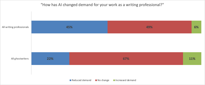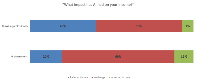 But the fact remains that within our sample, eight out of ten ghostwriters do not report a decline in demand or income due to AI — a far better situation than with other writers.